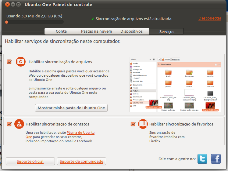 O Ubuntu One agora está mais bem acabado e possui um painel de controle com todas as funções e configurações centralizadas. Nele você gerencia seus arquivos, o que será sincronizado com a nuvem, instala e habilita novos tipos de sincronização e muito mais. Há também opções de feedback pelo Twitter e pelo Facebook.